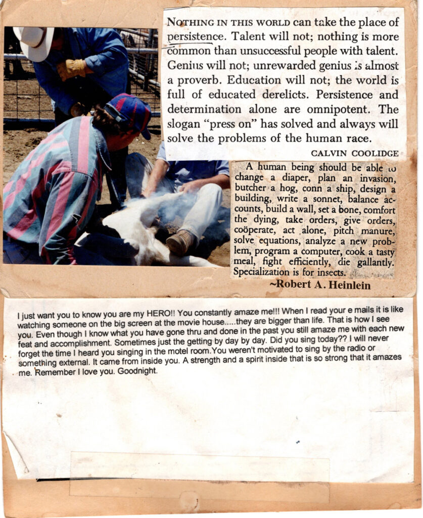 Here is one of me wielding the branding iron. I told the guys when we started that if they wanted to work on the ground they should catch the ones they wanted. As the day progressed the calves got smaller and smaller and more and more were in the pen to run through the squeeze chute. The note on the bottom was something that my sister emailed me one time .