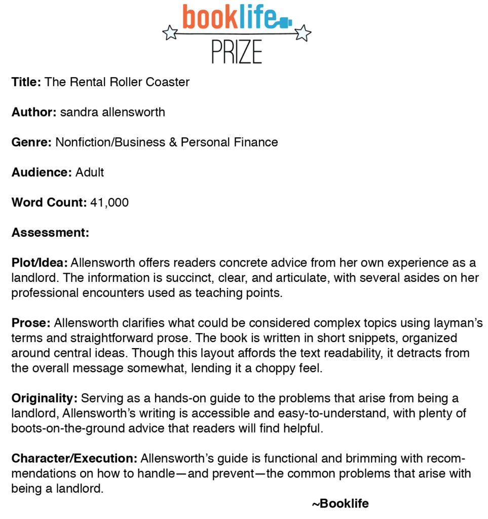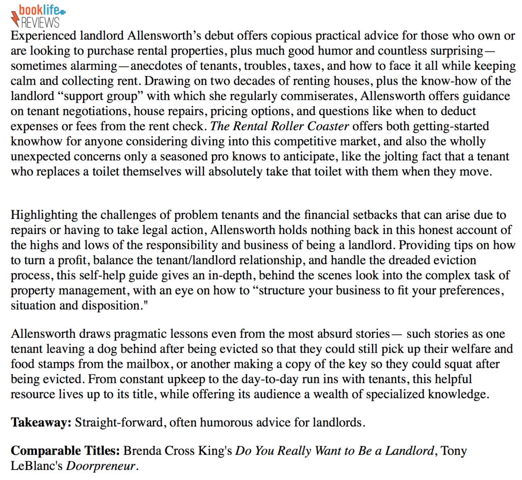 THE RENTAL ROLLERCOASTER~ Sandra Allensworth’s thoughts, ideas, and stories are excellent and will be exceptionally helpful to anyone contemplating becoming (or continuing to be) a landlord. ~ Larry Sydow